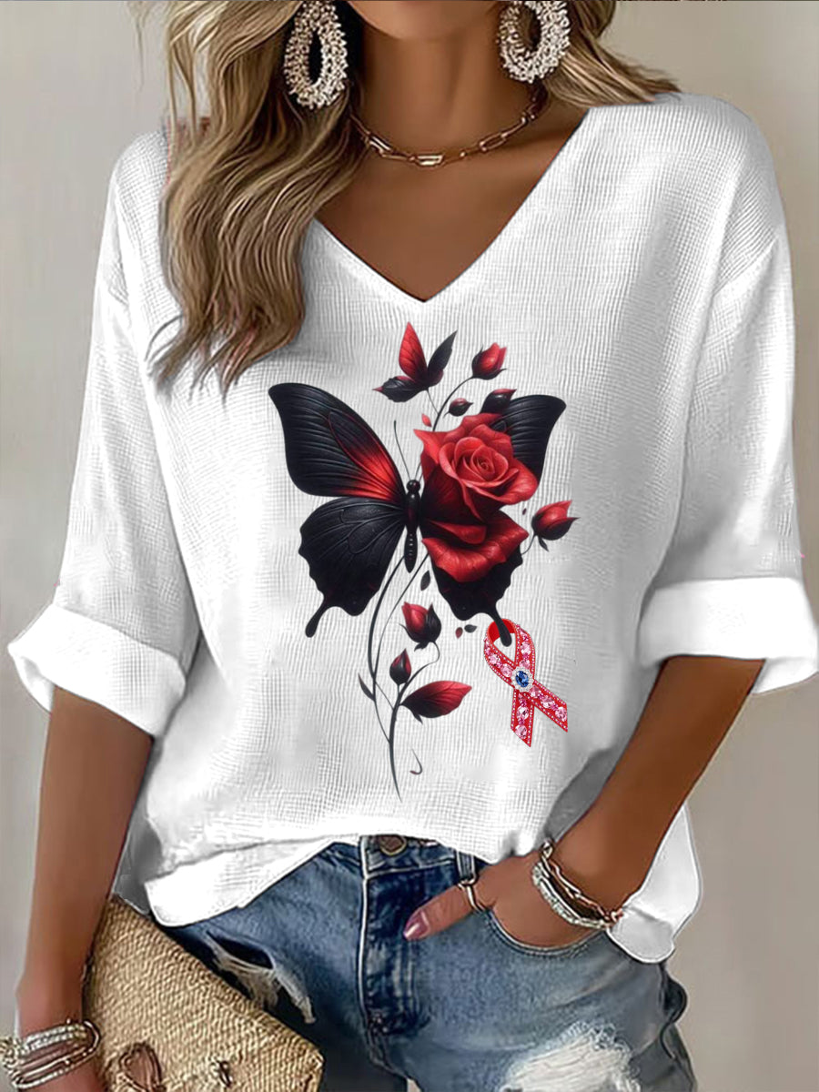 Γυναικεία κομψή πεταλούδα και κορδέλα λευκό V-λαιμό μακρυμάνικο πουκάμισο