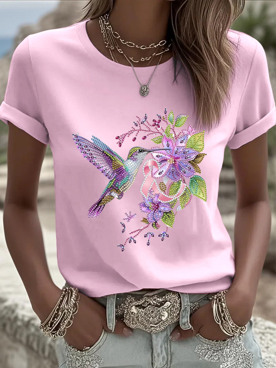 Γυναικεία μοντέρνα ευρωπαϊκά ροζ T-shirts, γοητευτικά κολιμπρί, λουλούδια και κορδέλες πρόληψης καρκίνου του μαστού, να δημιουργήσει μοντέρνα καθημερινά κορυφές
