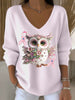 Γυναικείο ανοιχτό ροζ διαμάντι χαριτωμένο κουκουβάγια V-λαιμό πουλόβερ.