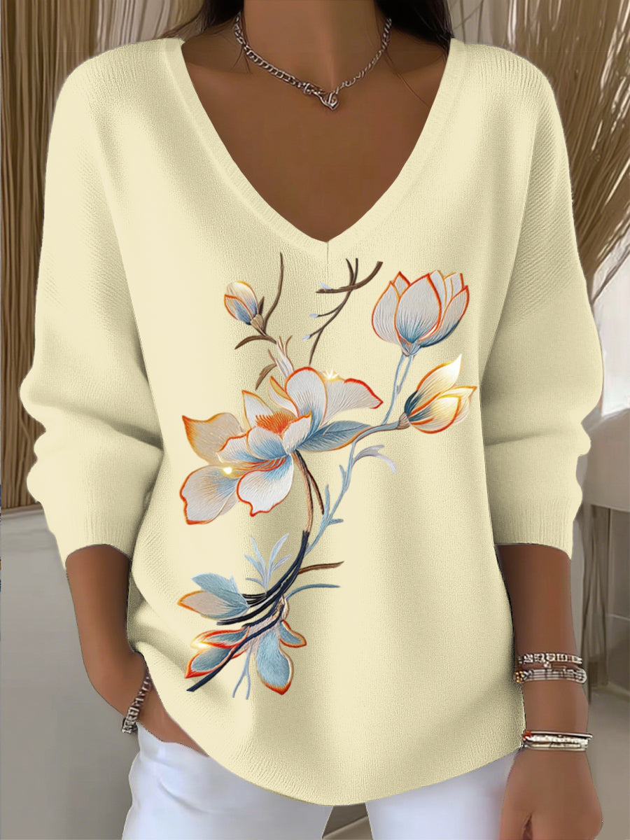Γυναικείο ευρωπαϊκό στυλ ανοιχτό κίτρινο V-λαιμό πουλόβερ, ζευγάρι με γοητευτικό λουλουδιά κεντήματα, μοντέρνα και άνετα, ανταπόκριση καθημερινών αναγκών