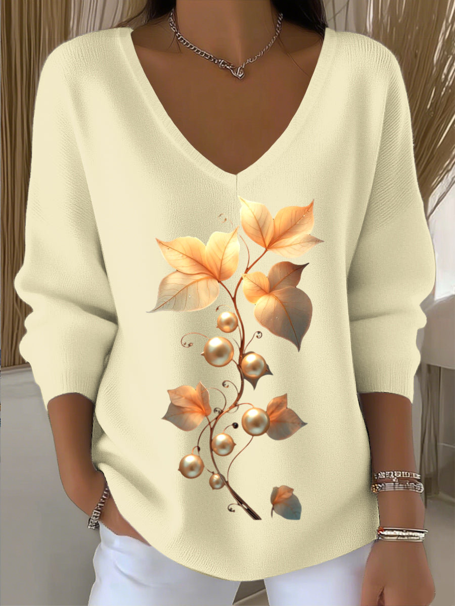 Γυναικείο ευρωπαϊκό στυλ ανοιχτό κίτρινο V-λαιμό πουλόβερ, στολισμένο με απλό λουλούδι, απλό και ατμοσφαιρικό, παρουσιάζοντας στυλ στην καθημερινή φθορά