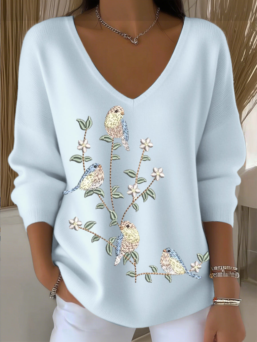 Γυναικείο ευρωπαϊκό στυλ ανοιχτό μπλε V-λαιμό πουλόβερ, συνδυασμένο με χαριτωμένο κέντημα πουλιών, μοντέρνο ιδιοσυγκρασία, κατάλληλο για καθημερινή φθορά