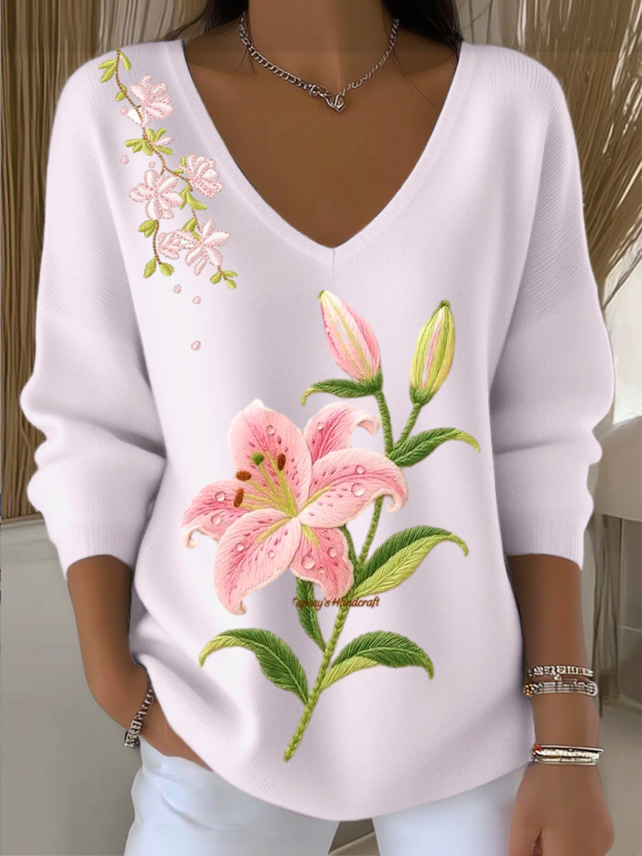 Γυναικείο ευρωπαϊκό στυλ ανοιχτό ροζ V-λαιμό πουλόβερ με όμορφο κρίνο κεντήματα, κλασικό και άνετο, κατάλληλο για διάφορες καθημερινές σκηνές
