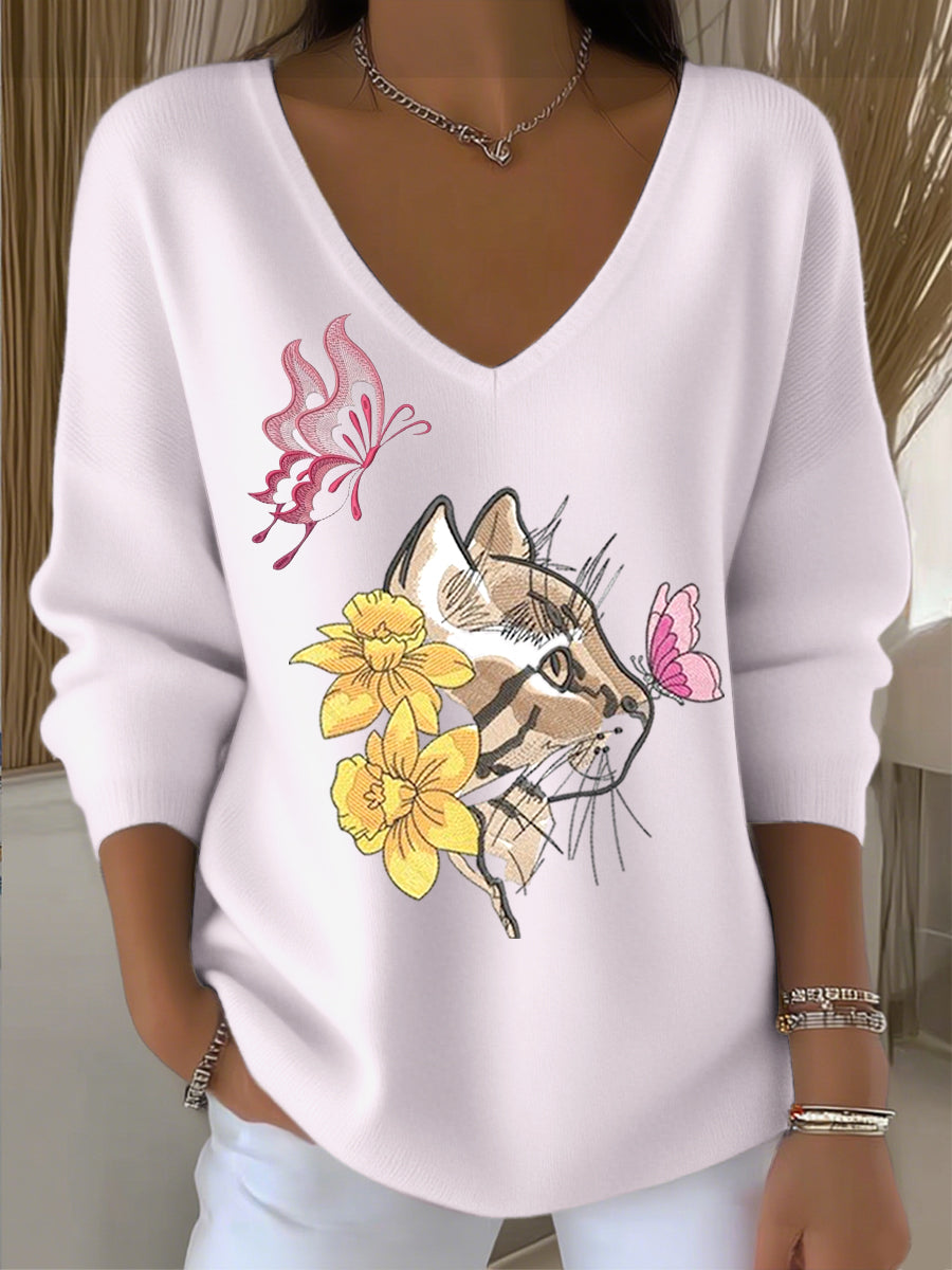 Γυναικείο ευρωπαϊκό στυλ ανοιχτό ροζ V-λαιμό πουλόβερ, στολισμένο με χαριτωμένες γάτες και λουλούδια κεντήματα, απλό και μοντέρνο, παρουσιαστικό στυλ σε καθημερινή φθορά