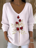 Γυναικείο ευρωπαϊκό στυλ ανοιχτό ροζ V-λαιμό πουλόβερ, στολισμένο με χαριτωμένο και ευαίσθητο λουλούδι κέντημα, κλασικό και άνετο, κατάλληλο για διάφορες καθημερινές σκηνές