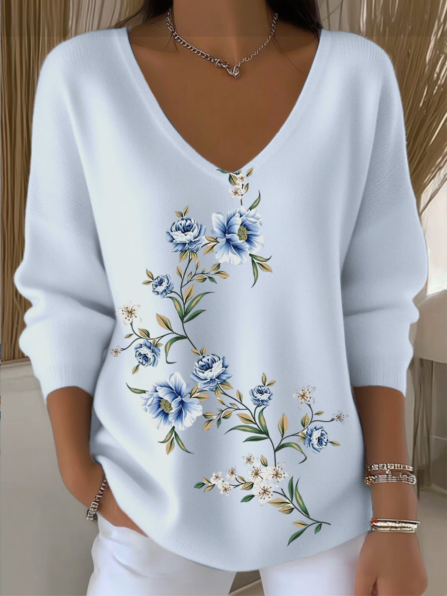 Γυναικείο ιδιούμενο λουλούδια κεντήματα μπλε V-λαιμό πουλόβερ.