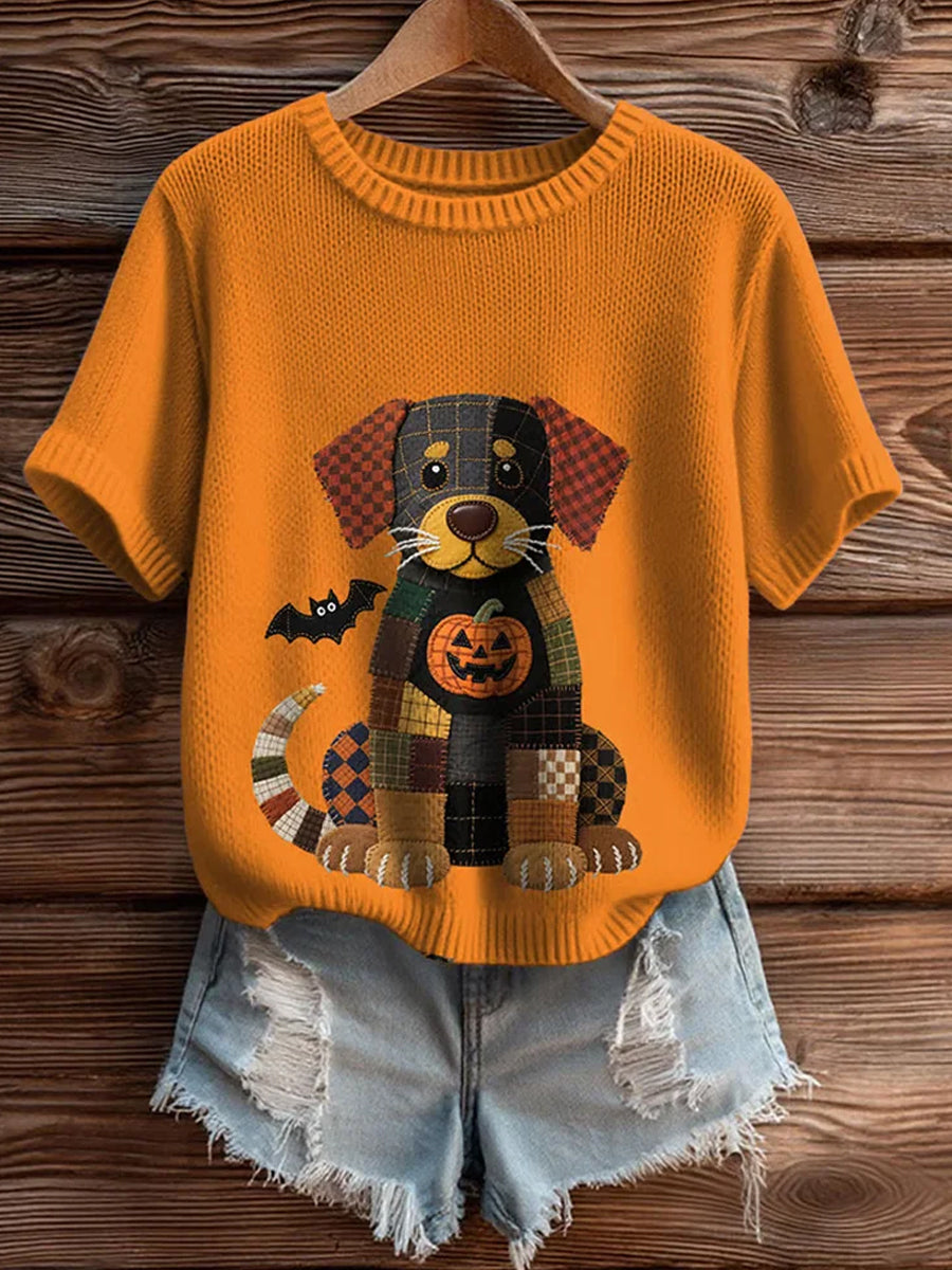 Γυναικείο καλλιτεχνικό ζώο εκτύπωση άνετο πλεκτό κοντό μανίκι κορυφού