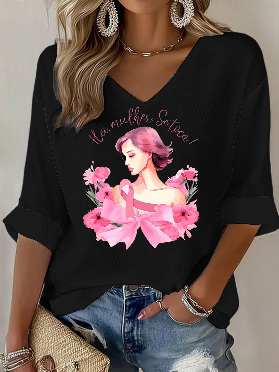 Γυναικείο κομψό θέμα καρκίνου του μαστού μαύρο V-λαιμό μακρύ μανίκι