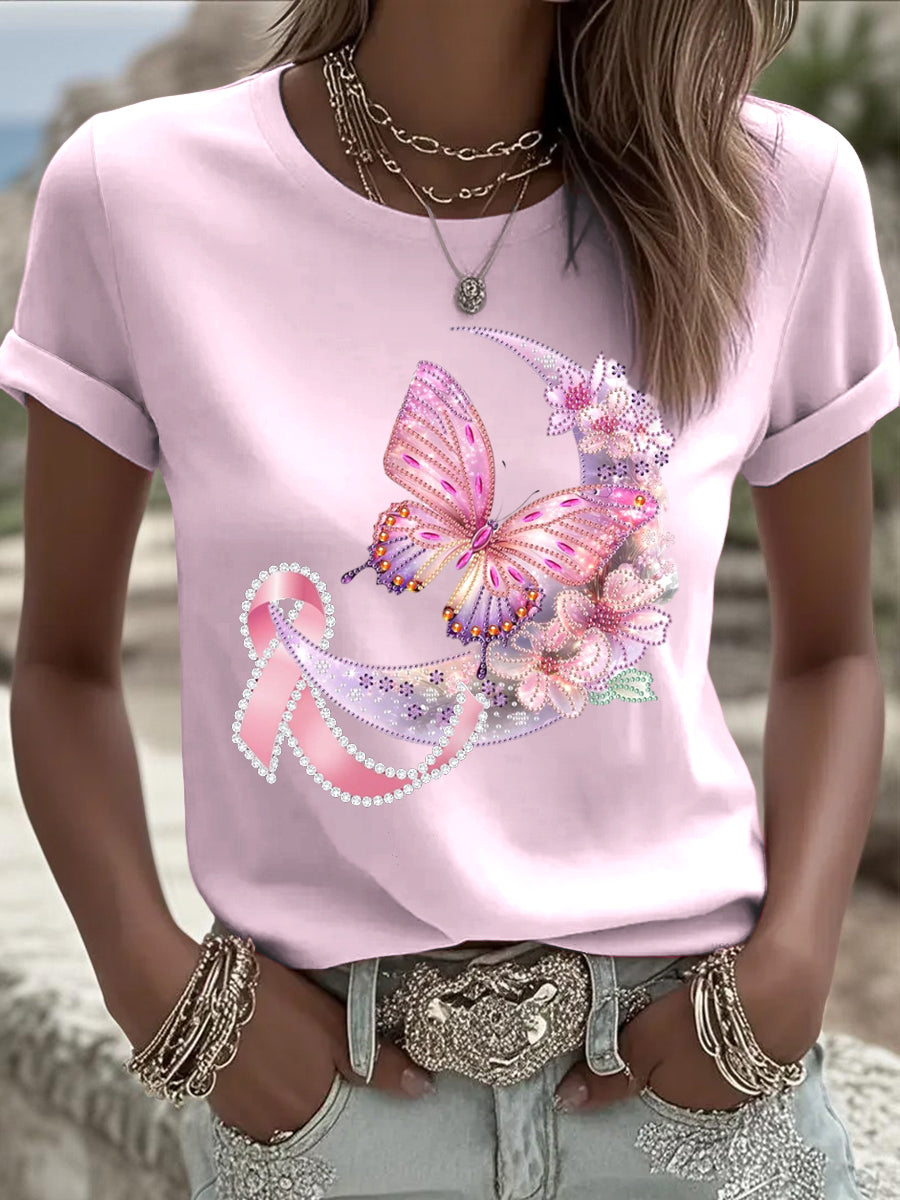 Γυναικείο μοντέρνο Ευρωπαϊκό ροζ T-shirt, με εξαιρετική πεταλούδα, λουλούδι και καρκίνο του μαστού, είναι απαραίτητο για τη μοντέρνα καθημερινή φθορά
