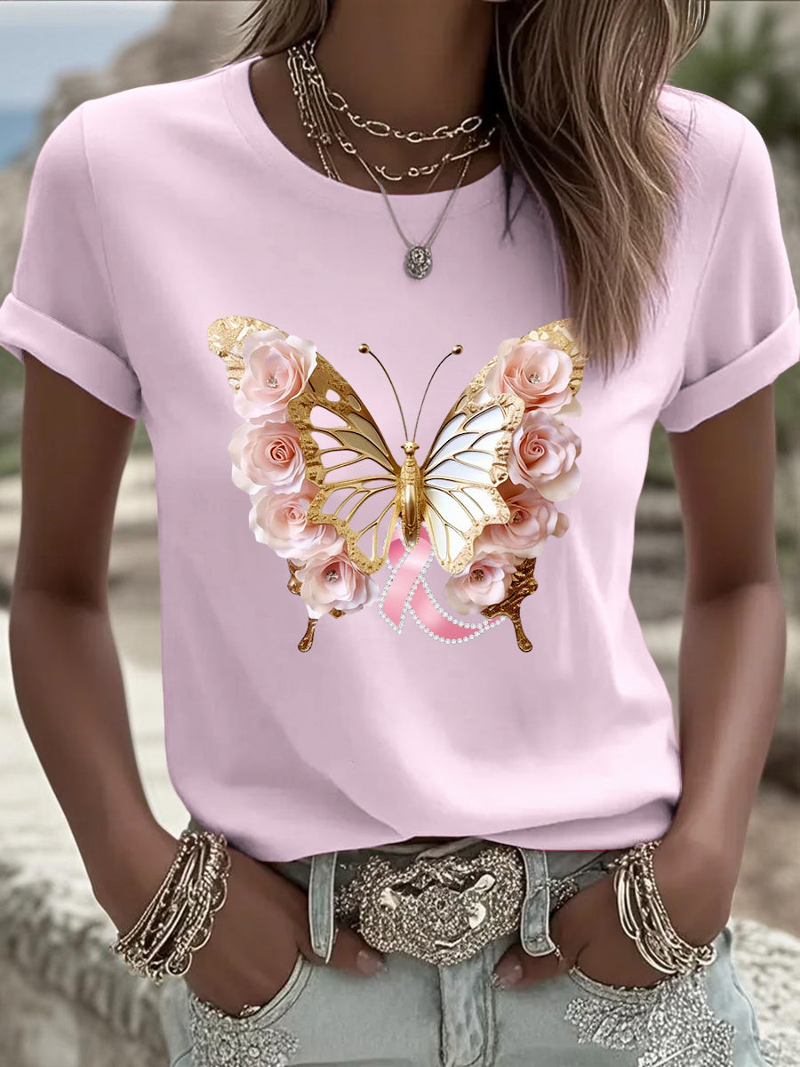Γυναικείο τριαντάφυλλο πεταλούδα και διαμάντι κορδέλα τυπωμένα περιστασιακό στρογγυλό λαιμό κοντό μανίκι