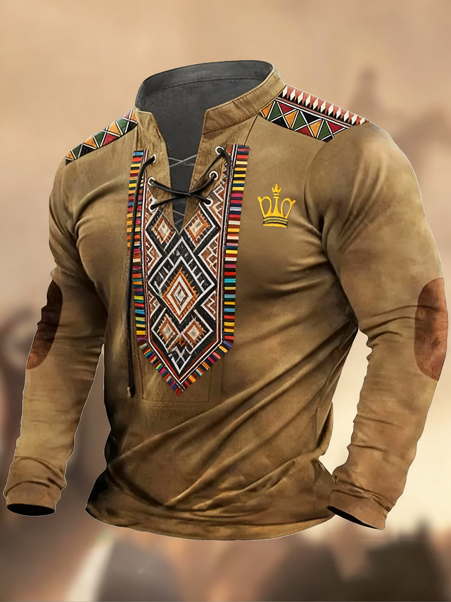 Vintage δυτική τέχνη εκτύπωση χώρα στυλ V-Neck Henley μακριά μανίκι πουκάμισα